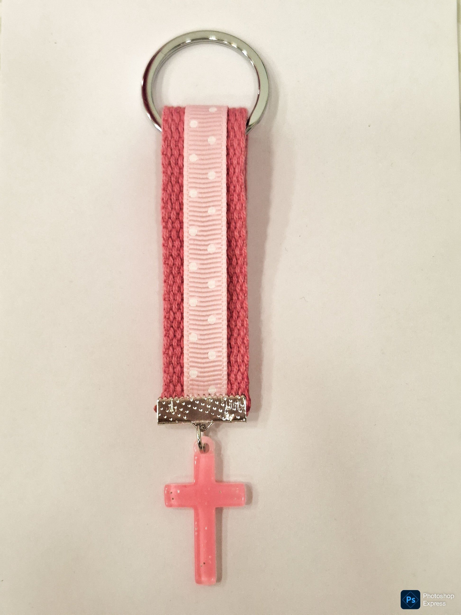 Llavero cinta lunares rosas con cruz acrílica.