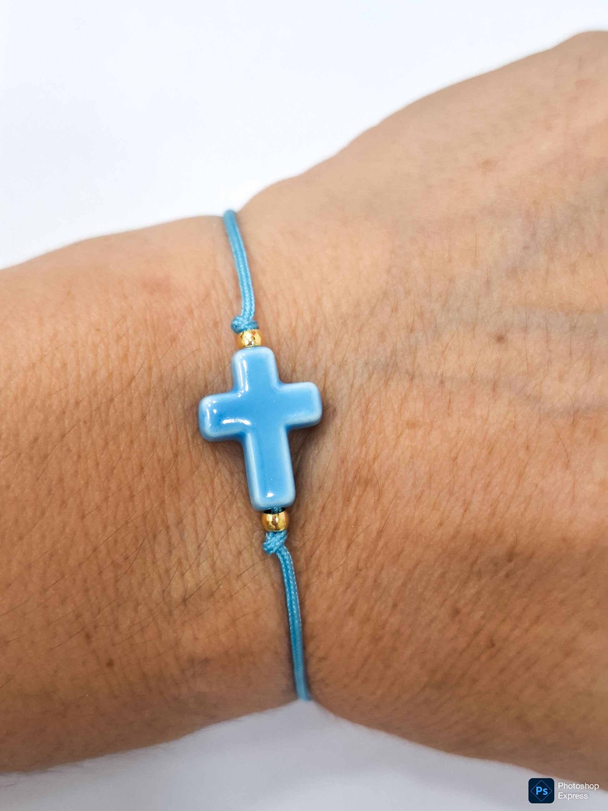 Pulsera de hilo trenzado con cruz de cerámica y bolas de acero.